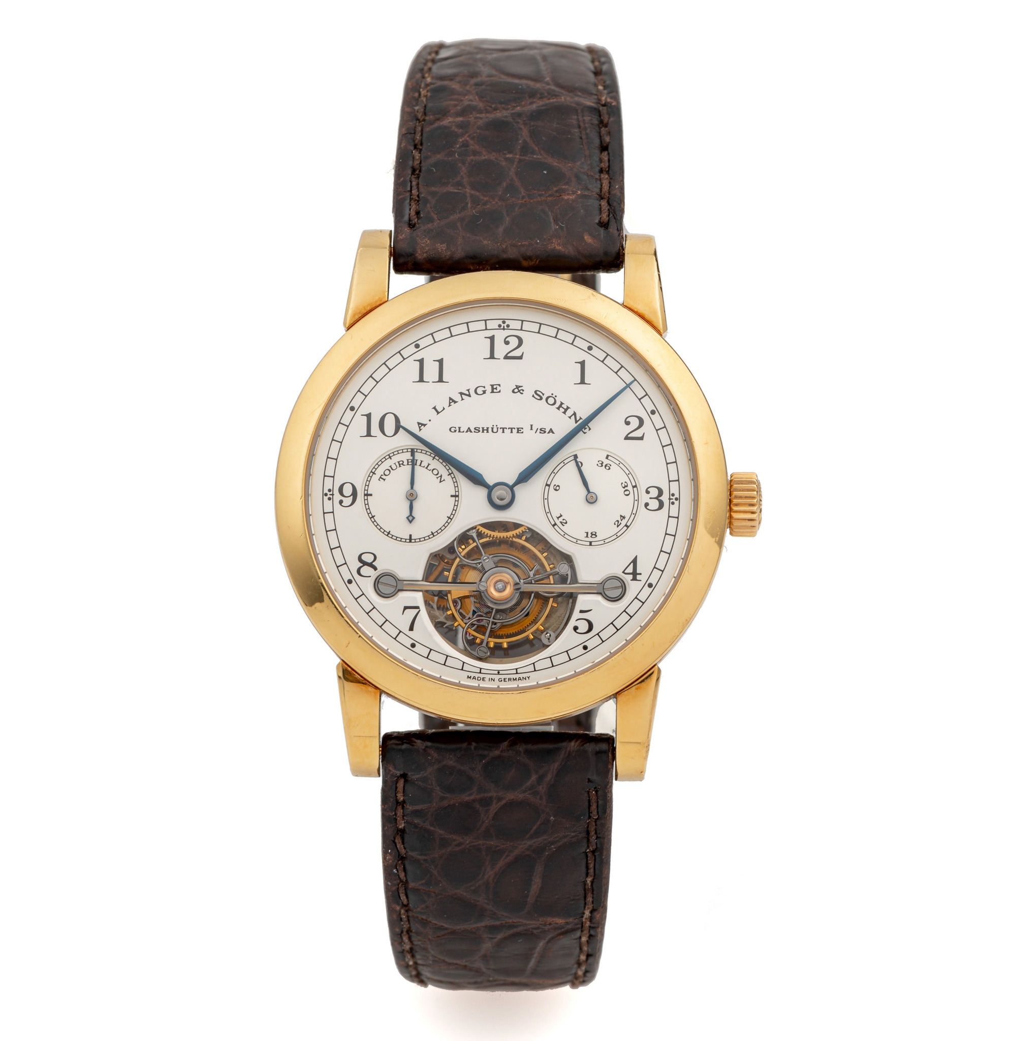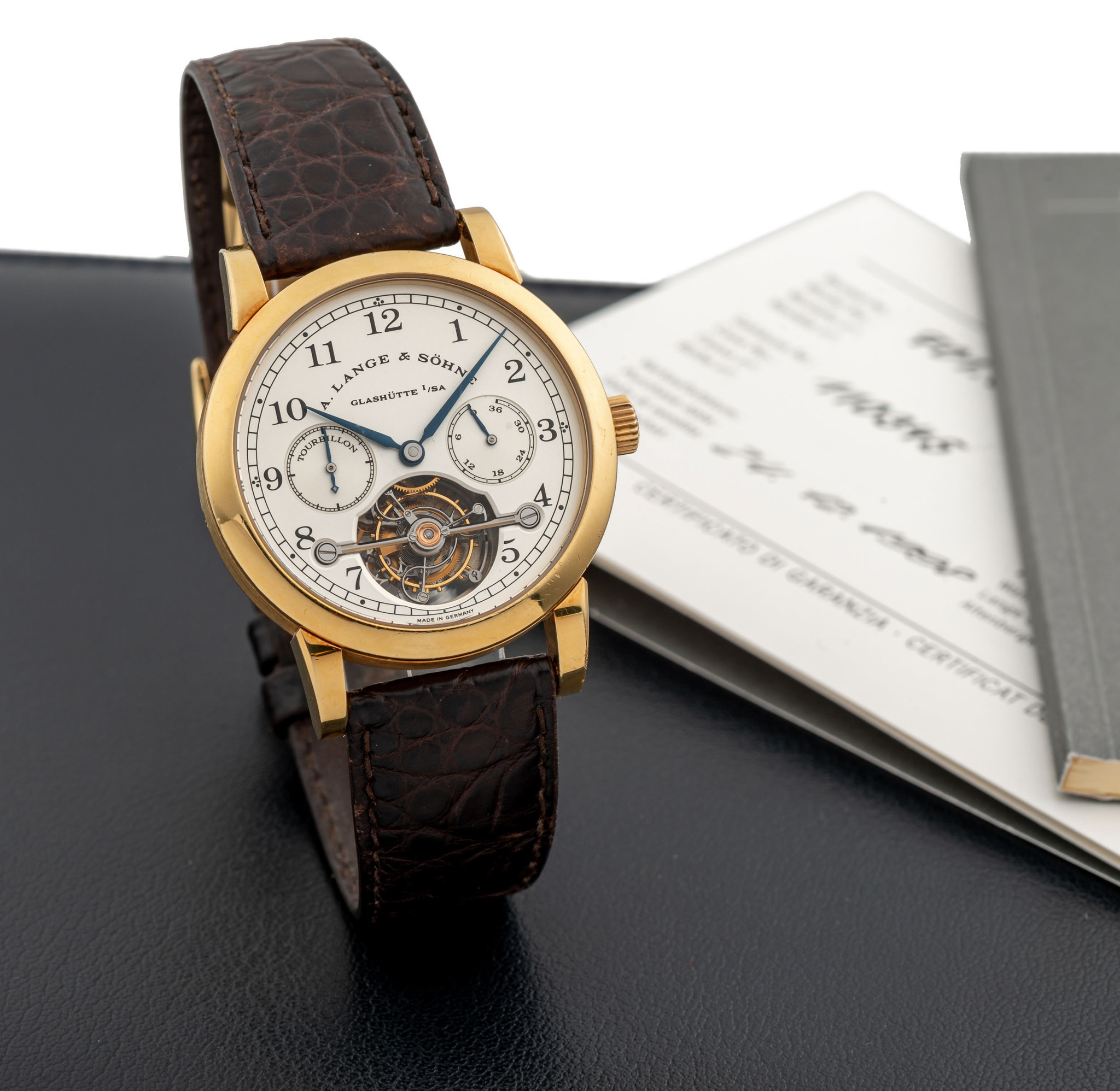 Nằm ở vị trí lot 435, chiếc đồng hồ A. Lange & Söhne Pour le mérite Tourbillon đại diện cho một dấu ấn quan trọng của nhà sản xuất đến từ Đức. Cái tên A. Lange & Söhne đại diện cho thương hiệu đồng hồ sang trọng nổi tiếng nhất tại Đức được thành lập vào năm 1845. Nhưng nhà sản xuất này không vận hành liên tục mà có thời gian phải dừng hoạt động. Tới năm 1994, A. Lange & Söhne tái sinh và Pour le mérite Tourbillon là một trong bốn mẫu đồng hồ được ra mắt vào năm đó.