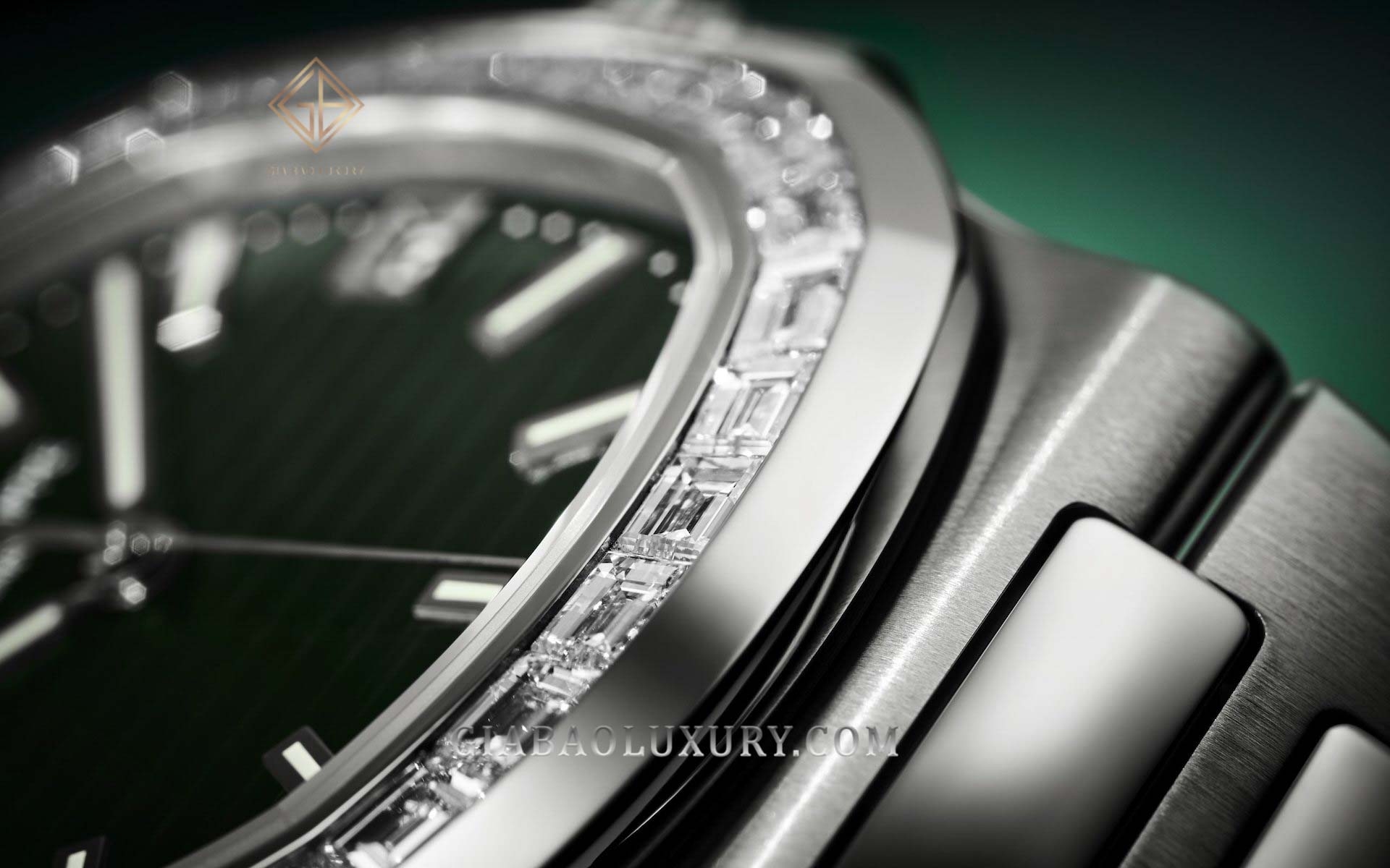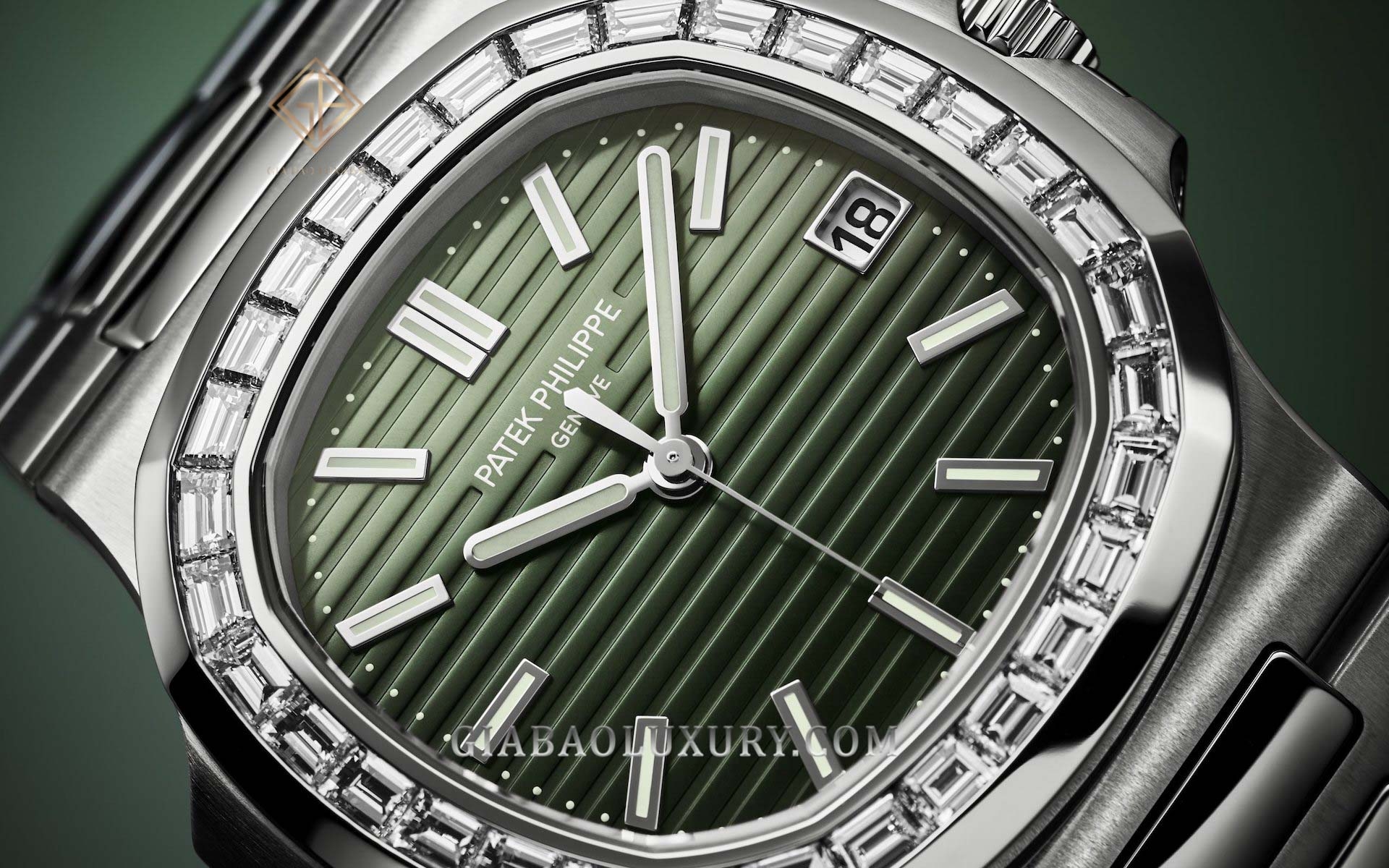 Cũng có mặt số xanh ô liu, chiếc đồng hồ Patek Philippe Nautilus 5711 còn lại được ra mắt trong năm nay tại sự kiện Watches & Wonders 2021 là 5711 / 1300A-001. Model này khác với model bên trên ở những viên kim cương baguette lấp lánh và sang trọng.