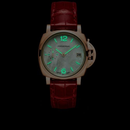 Chúng ta đã quen với việc đồng hồ Panerai luôn có một kích thước lớn, kể cả nam giới không phải ai cũng có thể đeo được đồng hồ Panerai. Nhỏ so với những chiếc Panerai thông thường, Panerai Piccolo Do Madreperla PAM01280 có kích thước là 38mm. Dù nhỏ hơn, chiếc đồng hồ vẫn sở hữu bộ phận bảo vệ núm điều chỉnh đặc thù của thương hiệu Panerai cùng dáng vỏ cushion chắc chắn làm từ Goldtech. Điều khiến Panerai Piccolo Do Madreperla PAM01280 vẫn có vẻ đẹp mềm mại của đồng hồ nữ là mặt số khảm trai trắng, cọc số bằng vàng phủ chất phát quang cùng dây đeo màu đỏ nổi bật.